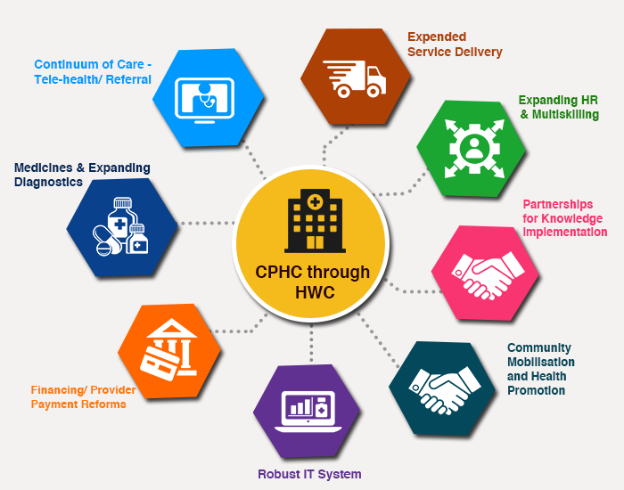 HWC are envisaged to deliver expanded range services that go beyond Maternal and child health care services to include care for non -communicable diseases, palliative and rehabilitative care, Oral, Eye and ENT care, mental health and first level care for emergencies and trauma , including free essential drugs and diagnostic services